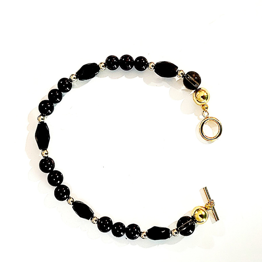 Smokey Quartz with 6mm round Garnet beads and 14k gold beads and toggle.