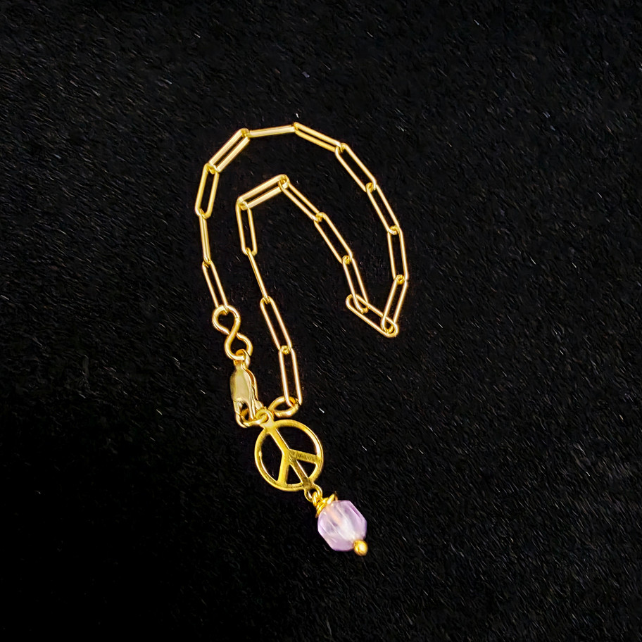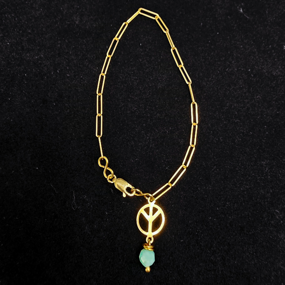 Gold-filled paperclip chain bracelet with a 14k gold peace symbol, holding the crystal of your choice! Made at 7" unless otherwise requested.